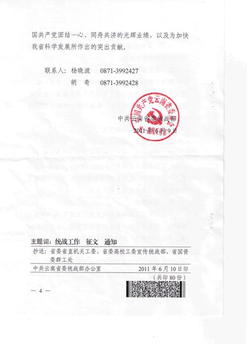 附件:中共云南省委统战部《关于开展建党90周年征文的通知》